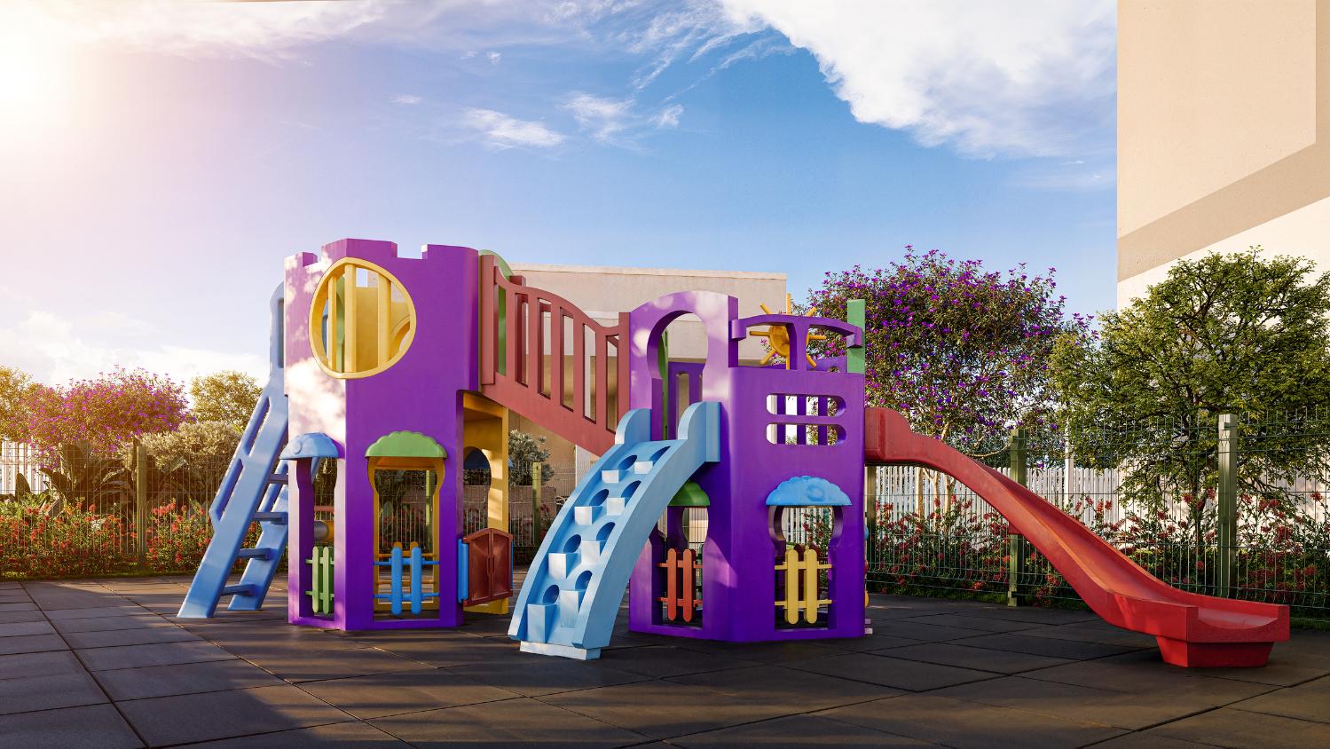 Área de lazer completa: playground com piso emborrachado, redário, espaço fogo, praça e churrasqueira coberta.